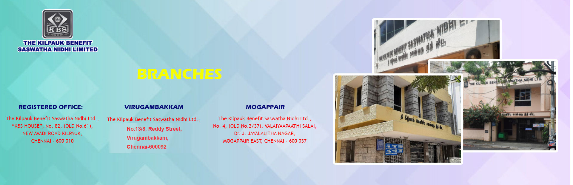 The Kilpauk Benefit Saswatha Nidhi Limited (KBS) was established in the year 1975 with the motive of inculcating the habit of saving and investment among all classes of people as its Members, so that the amount pooled could be lent to the needy Members on the security of movable or immovable assets at a reasonable rate of interest.